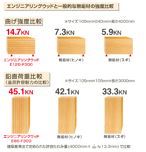 「割れにくい」「反りにくい」「曲がりにくい」「ねじれにくい」などの特徴をもつため、品質のばらつきが少なく高い安全性、高品質を実現できます。